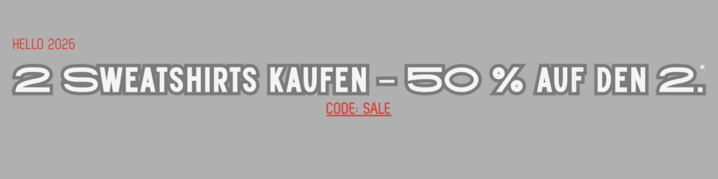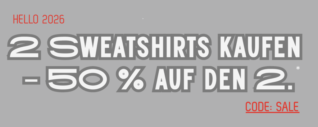 *Der Rabatt wird auf den günstigeren Artikel des Types „Sweatshirt“ angewendet. Rabatt gilt nur auf ein Sweatshirt. Nicht auszahlbar. Der Code „Sale“ muss dafür im Warenkorb, oder in der Kasse angewendet werden. Gültig bis 08.12.2026, nicht mit anderen Aktionen kombinierbar, nur solange der Vorrat reicht